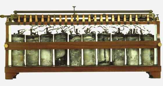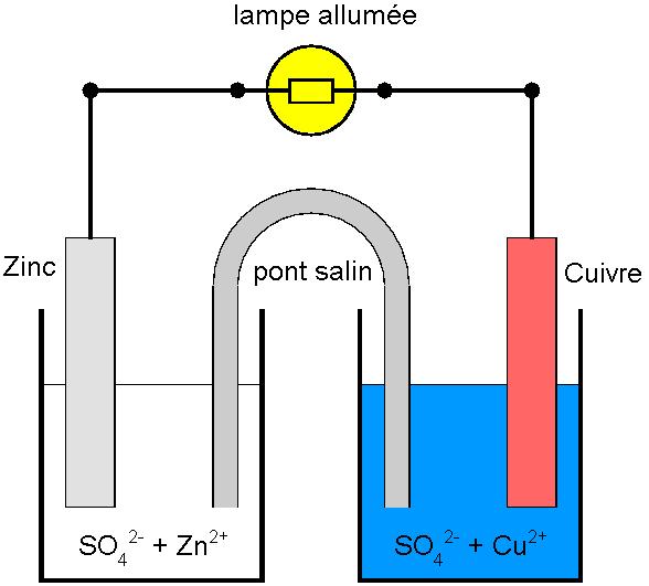 1836 -> La pile Daniell : Elle a été inventée par le chimiste britannique John Daniell en 1836 au moment où le développement du télégraphe faisait apparaître un besoin urgent de sources de courant sûres et constantes. La pile de Daniell est une pile dans laquelle s'effectue une réaction d'oxydo-réduction, dont l'échange d'électrons entre le zinc, servant d'anode, et le cuivre, servant de cathode, est à l'origine du courant électrique. La pile est constituée de deux compartiments dont l'un contient une solution de sulfate de zinc dans laquelle est immergée une plaque de zinc métallique. L'autre compartiment de la pile contient une solution de sulfate de cuivre dans laquelle baigne une plaque métallique de cuivre. Les deux solutions sont reliées par un pont satin appelé aussi pont électrolytique (solution de chlorure de potassium) qui sert à équilibrer les charges.