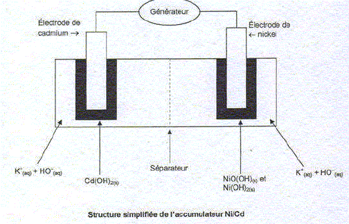 1899 -> L’accumulateur nickel-cadmium : il a été inventé par Waldemar Jungner qui était un ingénieur suédois. Dans un accumulateur nickel-cadmium chargé, l’électrode positive est constituée d’oxo hydroxyde de nickel et de graphite de l’électrode négative est un cadmium. L’électrolyte est une solution aqueuse concentrée d’hydroxyde de potassium. L’électrolyte participe aux réactions de décharge et de charge, mais sa concentration ne change pas.